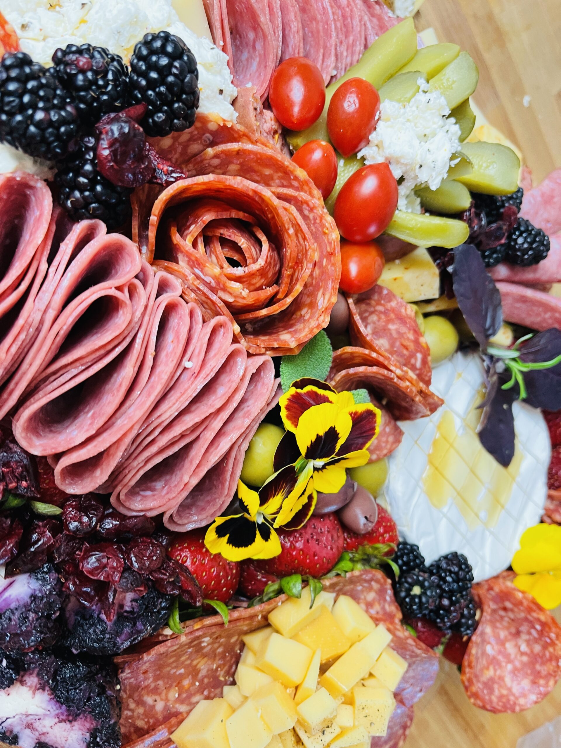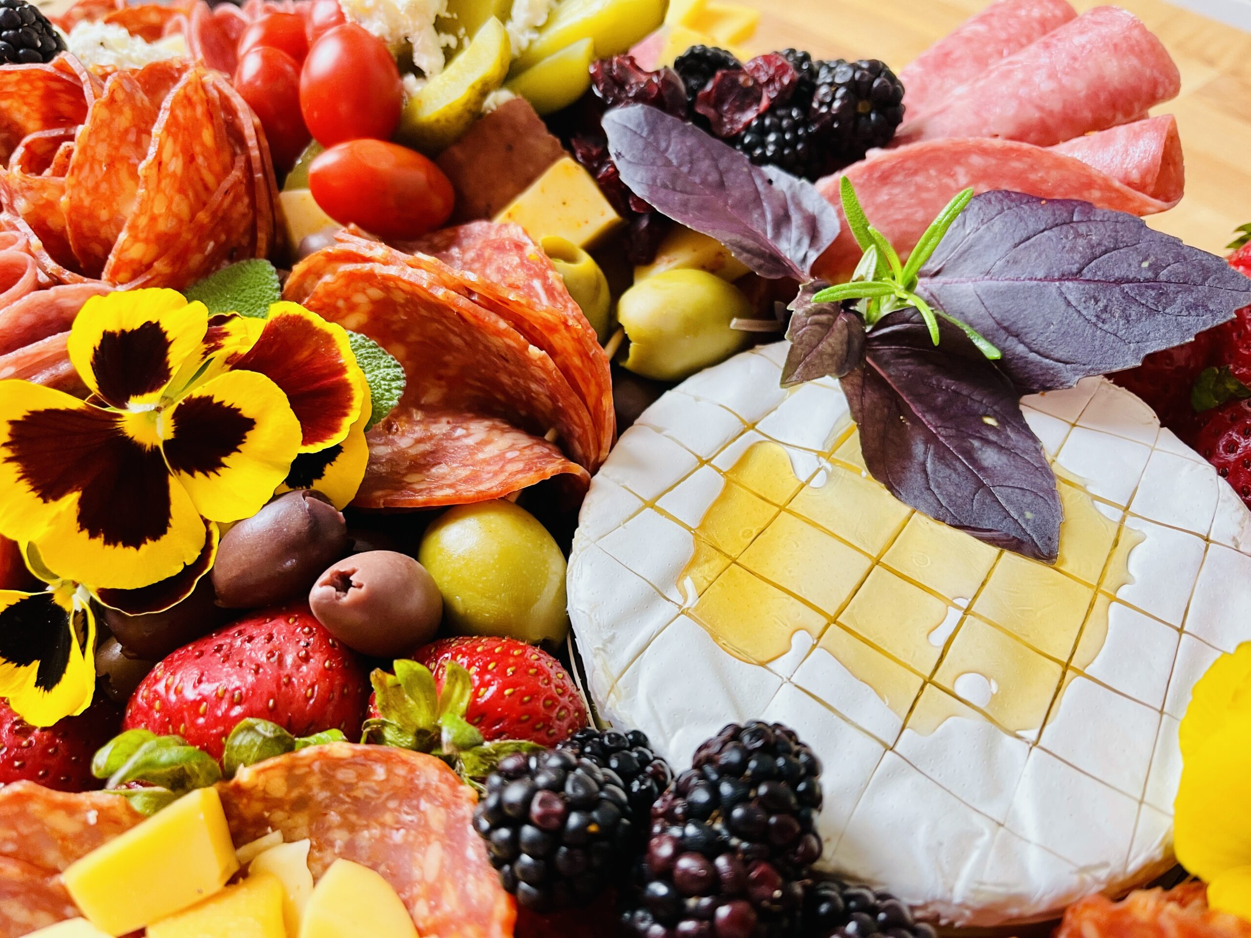 - Details: Honey topped brie is surrounded by tart berries, cured meats, olives, and cheeses. The purple basil and edible pansies are lovely unexpected touches that make this board shine.