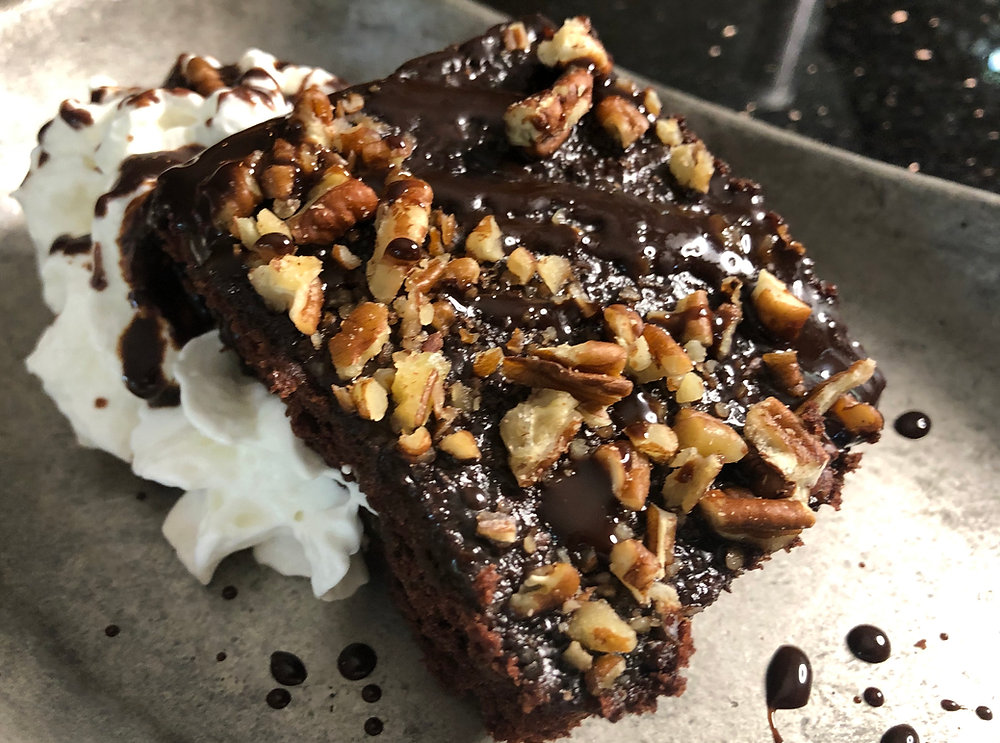 - To assemble cake, pour icing over the top of the warm cake. Garnish with walnuts or pecans, if desired.